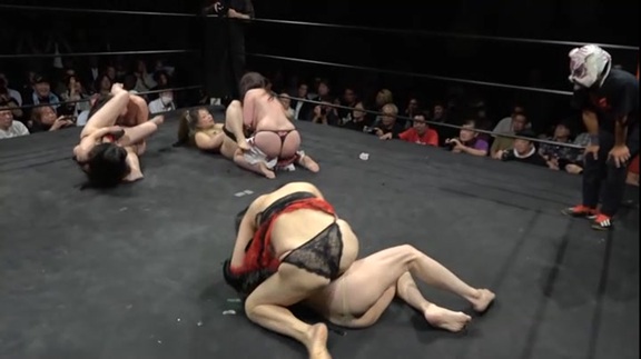 必至で守る選手もいれば、笑いながら相手のパンツに手を入れて引っ張る人も・・・リングの上には一人に対して数人で責めたり、6人がお互いにユニフォームを脱がせにいったり、観客はカメラを構え見えそうで見えない選手の体に注目!